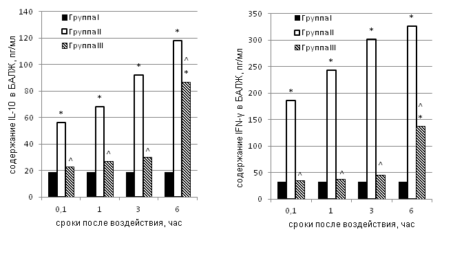 При анализе содержания IL-10 и IFN-γ выявлена схожая динамика. Так, у животных группы II достоверно увеличивается содержание данных цитокинов во все сроки по сравнению с животными групп I и III. Значимое увеличение содержания IL-10 и IFN-γ у животных группы III по сравнению с контролем наблюдалось только через 6 ч после воздействия (рис. 3). Такое увеличение противовоспалительных цитокинов расценивалось как следствие компенсаторной реакции на возникшую острую воспалительную реакцию.