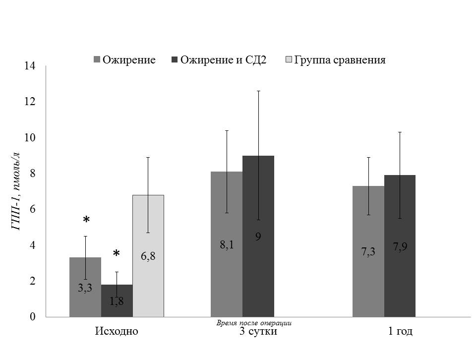 Значимой разницы уровней ГПП-1 исходно, на 3-и сутки и через 1 год после бариатрического вмешательства выявлено не было.