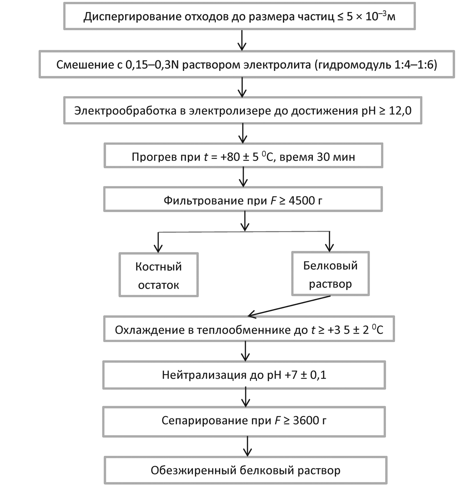 Для электрохимической обработки использовали электролизеры с плоскопараллельным расположением электродов, разделенных ионоселективной мембраной. Были выбраны оптимальные параметры обработки дисперсного сырья, что обеспечило полное растворение фракции белка: ток, напряжение, время обработки суспензии в электролизере, время нагрева суспензии после электролизера в реакторе с мешалкой. Нерастворимый костный остаток отделяли центрифугированием. Липиды из раствора белка выделяли методом сепарирования.