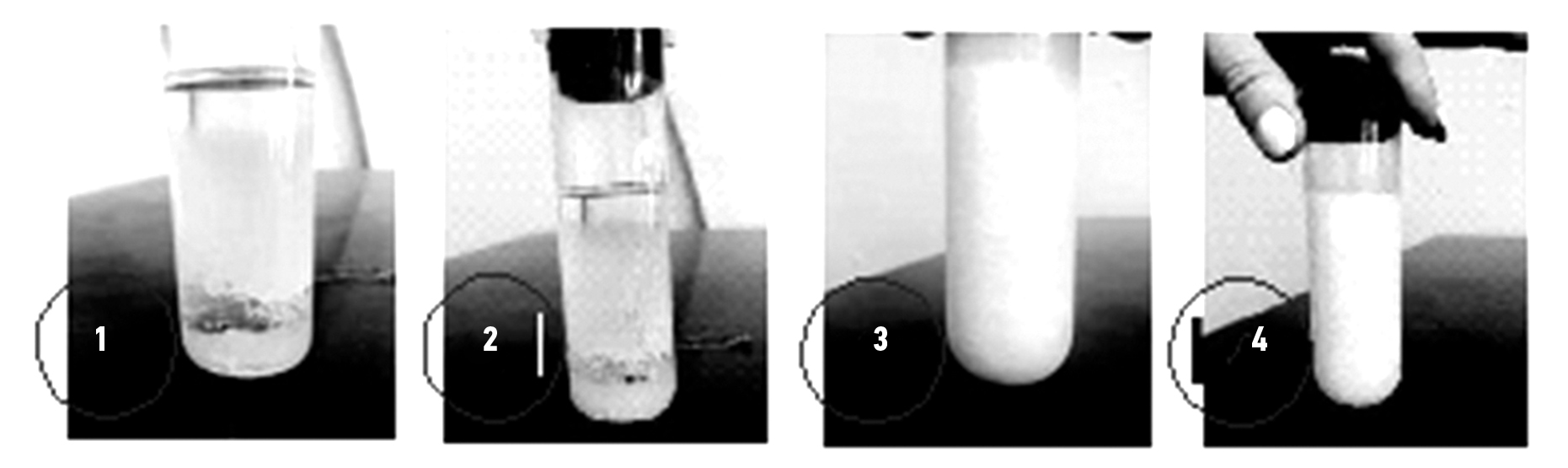 Рис. 2. Жировые фракции, полученные при криоконцентрировании БАВ липоидной природы из вторичного рыбного сырья: 1 – образец жира при +4 °С; 2 — жидкая жировая фракция, отделенная от образца 1 при –6 °С; 3 — жидкая жировая фракция, выделенная из образца 2 при –14 °С; 4 — жидкая жировая фракция, выделенная из образца 3 при –37 °С
