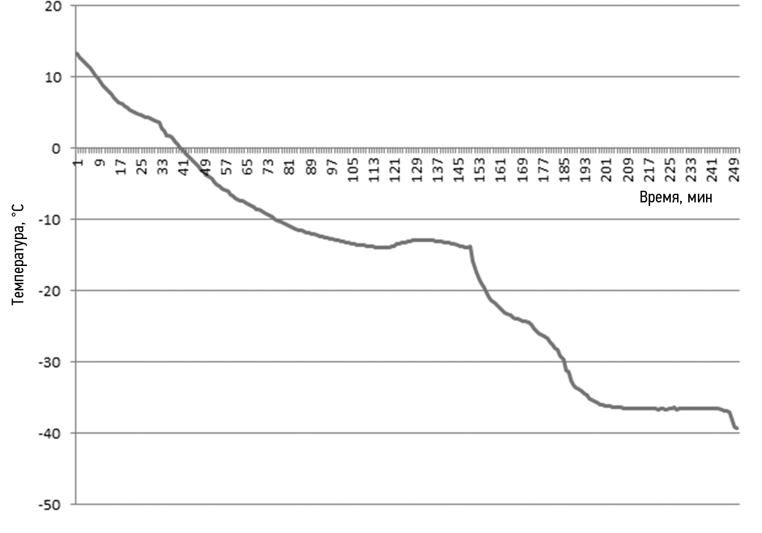 В ходе эксперимента охлаждения БАВ липоидной природы из вторичного рыбного сырья была получена кривая зависимости температуры от времени (рис. 3), где наблюдались участки фазовых переходов и разделения фракций, что соответствует данным патента РФ № 2031923 [17].