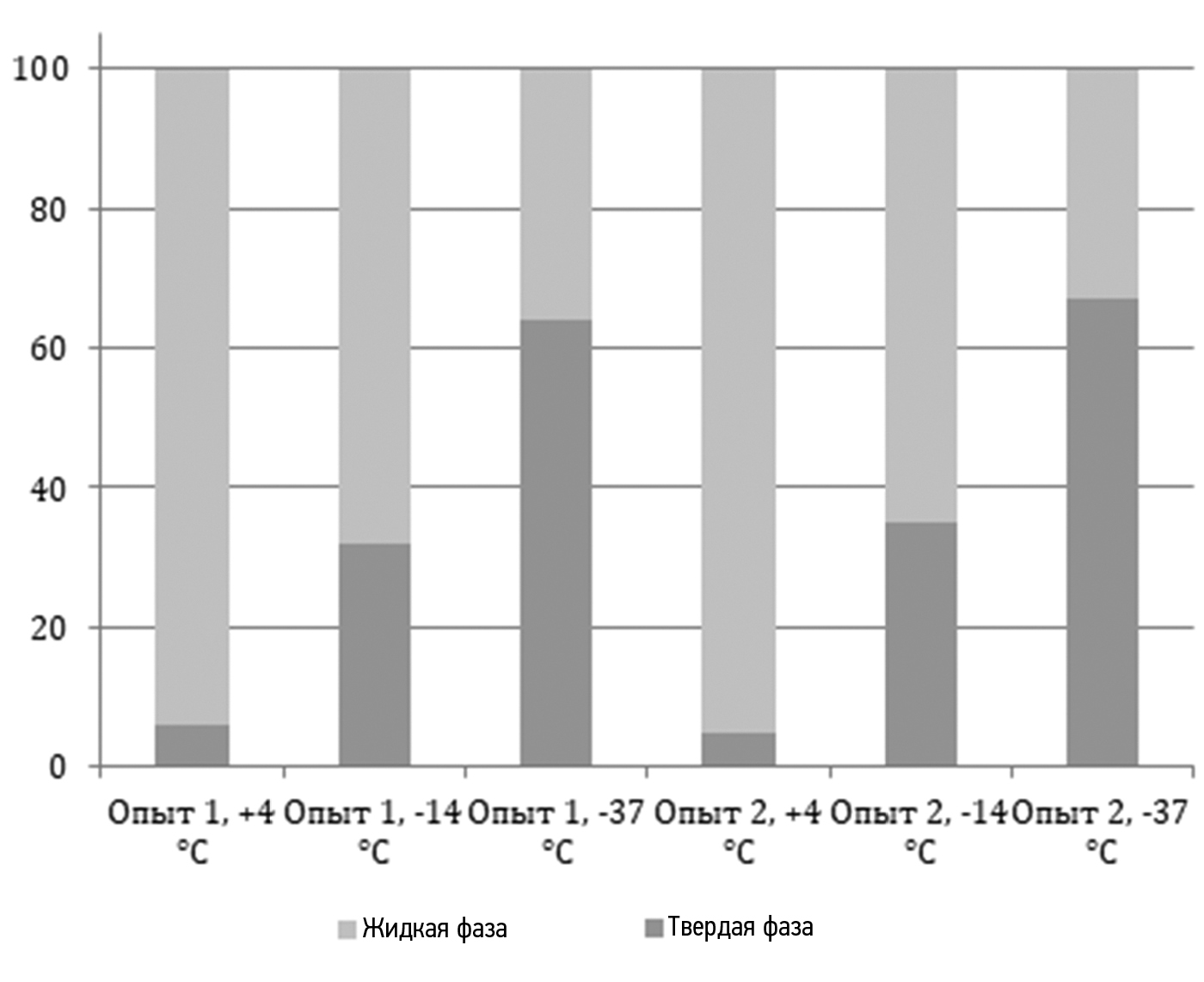 Фракционное деление липидов осуществлялось путем криоконцентрирования. Для этого рыбий жир охлаждали в стеклянных пробирках объемом 50 мл, помещенных в емкость с 28% раствором хлористого кальция, охлаждаемого низкотемпературной холодильной установкой. Температура измерялась внутри образца и в охлаждающей среде с помощью электронных термометров марки Vapan (Россия). После фиксирования фазовых переходов в жире при температурах +4, –6, –14 и –37 °С жир смешивали с ацетоном в соотношении 1:8 и затем повторяли охлаждение от +20 до –40 °С. После каждого фазового перехода жир разделяли на твердую и жидкую фракции фильтрованием.