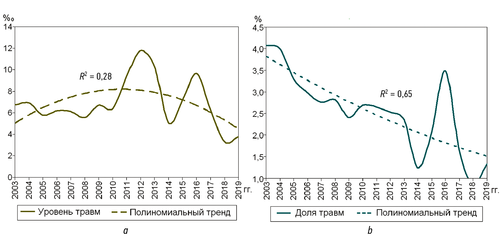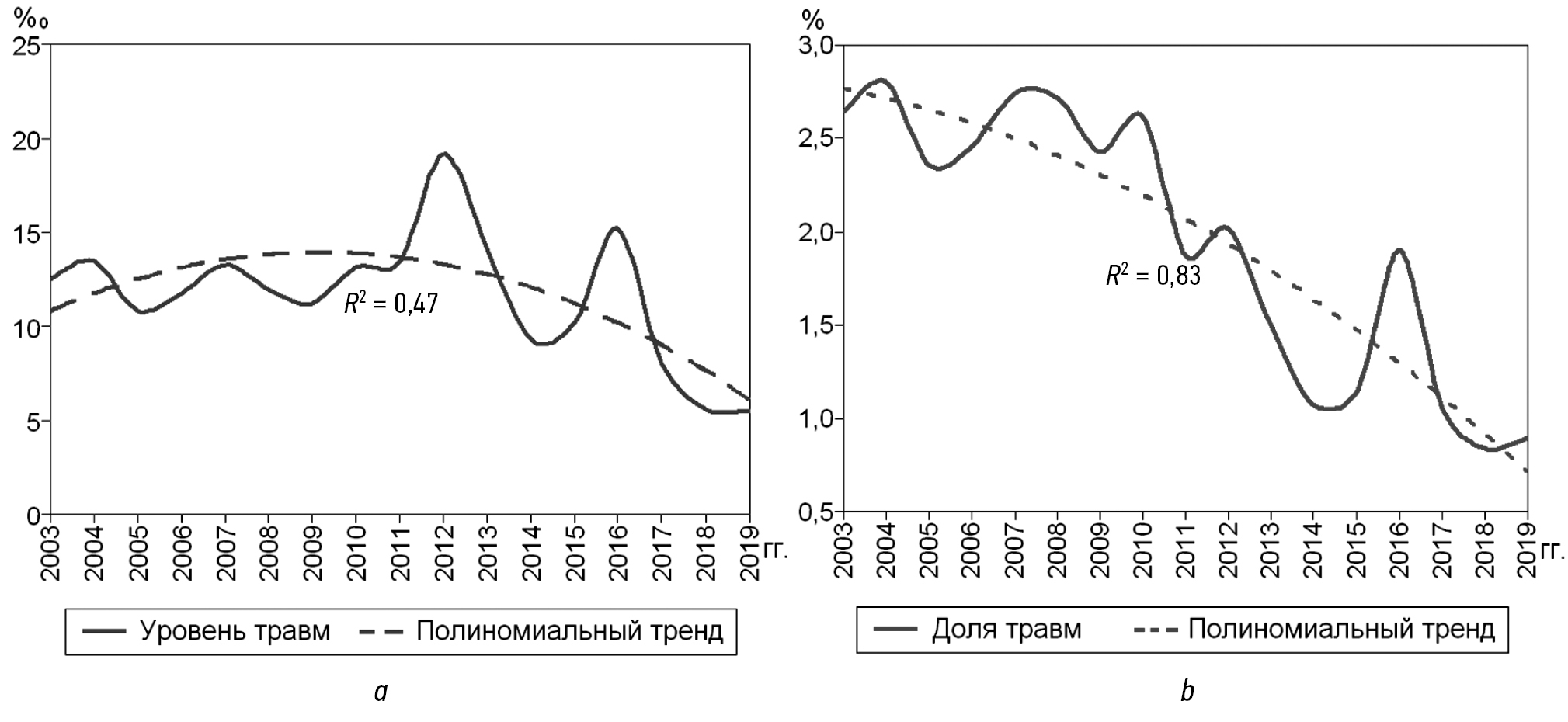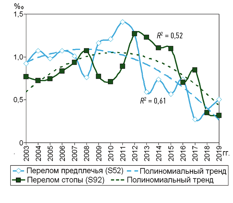 Статистическую обработку провели с использованием программы Excel (Microsoft Corp., США). Представлены средние арифметические показатели и их статистические ошибки (M ± m). Динамику и прогнозирование показателей травм оценивали с помощью анализа динамических рядов и расчета полиномиального тренда второго порядка [11]. Силу связи показателей полиномиального тренда определяли при помощи коэффициента детерминации (R2), который характеризовал связь динамики показателей травматизма с построенной кривой (трендом). Чем больше был R2 (максимальный показатель — 1), тем более объективно был создан тренд. Значок ↑ —показывал рост показателей, ↓ — уменьшение, ∪ — динамика напоминала U-кривую, ∩ — инвертированную U-кривую.