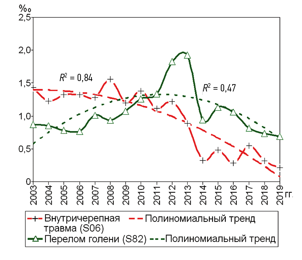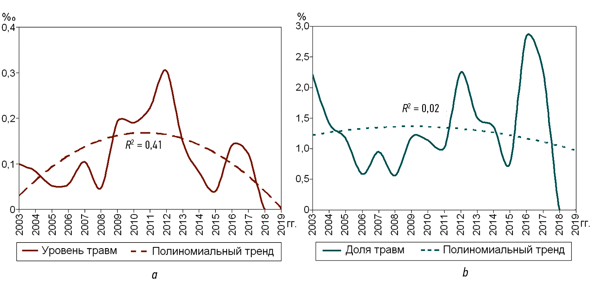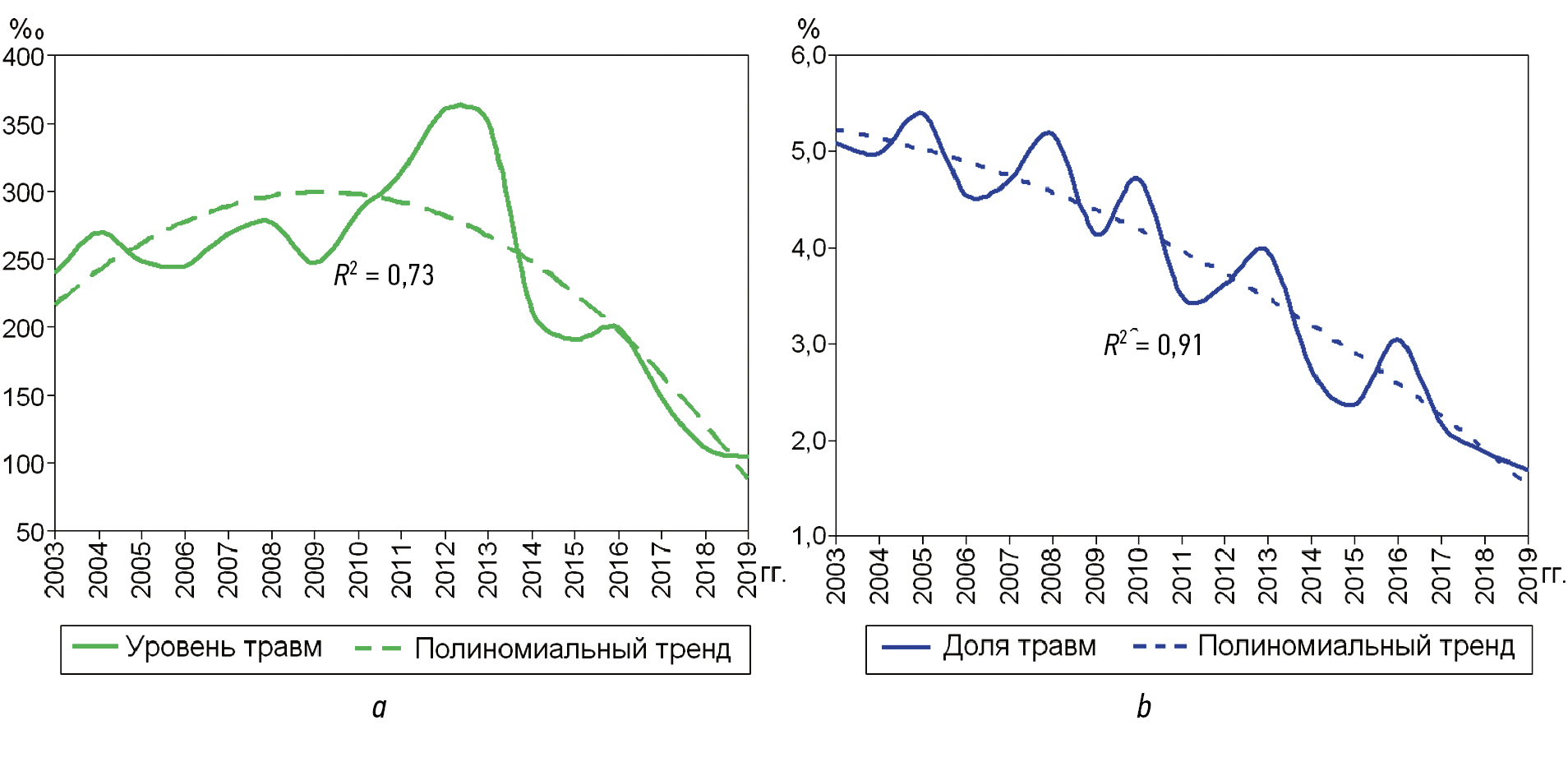 Статистическую обработку провели с использованием программы Excel (Microsoft Corp., США). Представлены средние арифметические показатели и их статистические ошибки (M ± m). Динамику и прогнозирование показателей травм оценивали с помощью анализа динамических рядов и расчета полиномиального тренда второго порядка [11]. Силу связи показателей полиномиального тренда определяли при помощи коэффициента детерминации (R2), который характеризовал связь динамики показателей травматизма с построенной кривой (трендом). Чем больше был R2 (максимальный показатель — 1), тем более объективно был создан тренд. Значок ↑ —показывал рост показателей, ↓ — уменьшение, ∪ — динамика напоминала U-кривую, ∩ — инвертированную U-кривую.