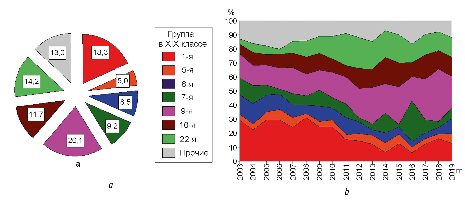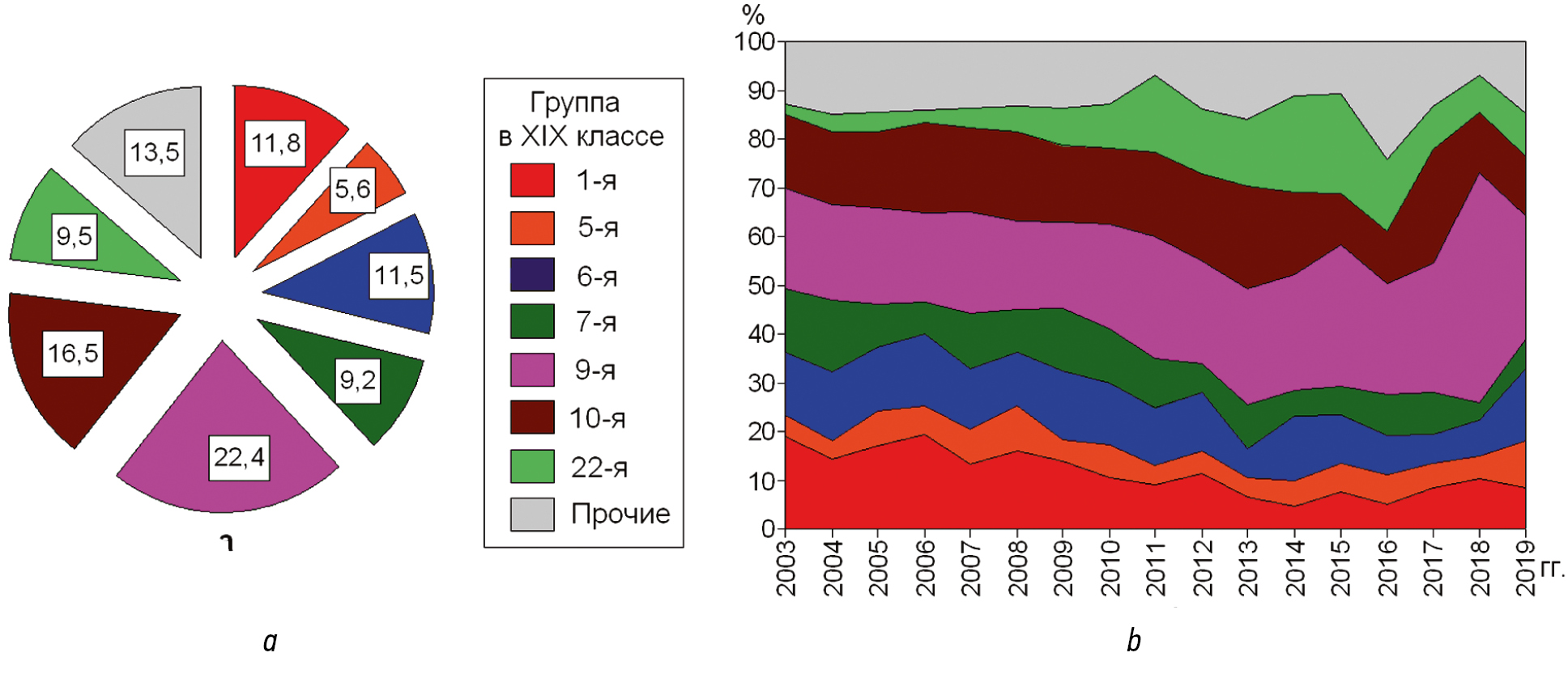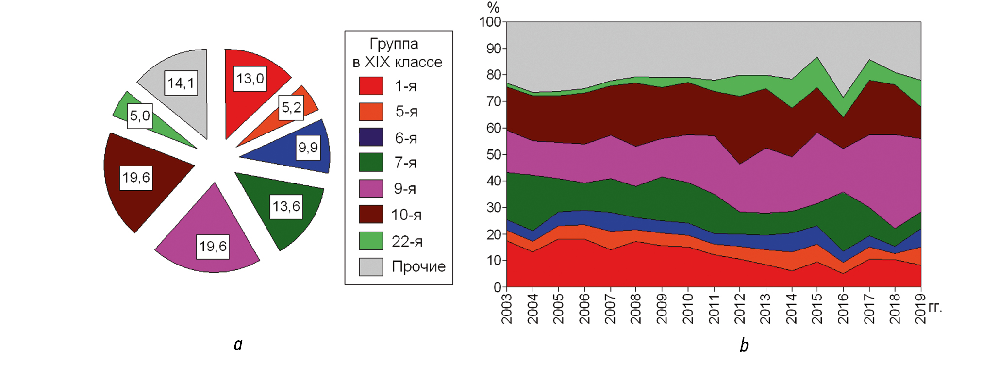 Ведущих групп с долей 5% и более в структуре травматизма было 6. В сумме их вклад составил 85,9% (рис. 2 а). В динамике структуры травматизма отмечается уменьшение вклада 1-й, 6-й и 10-й группы, увеличение — 7-й, 9-й и 22-й группы и относительная стабильность доли — 5-й группы (рис. 2 b).
