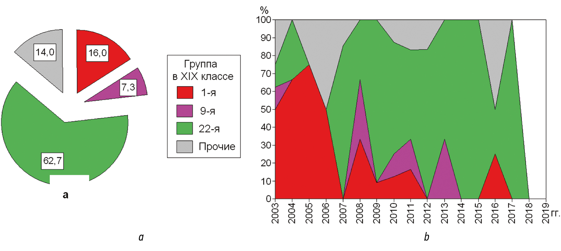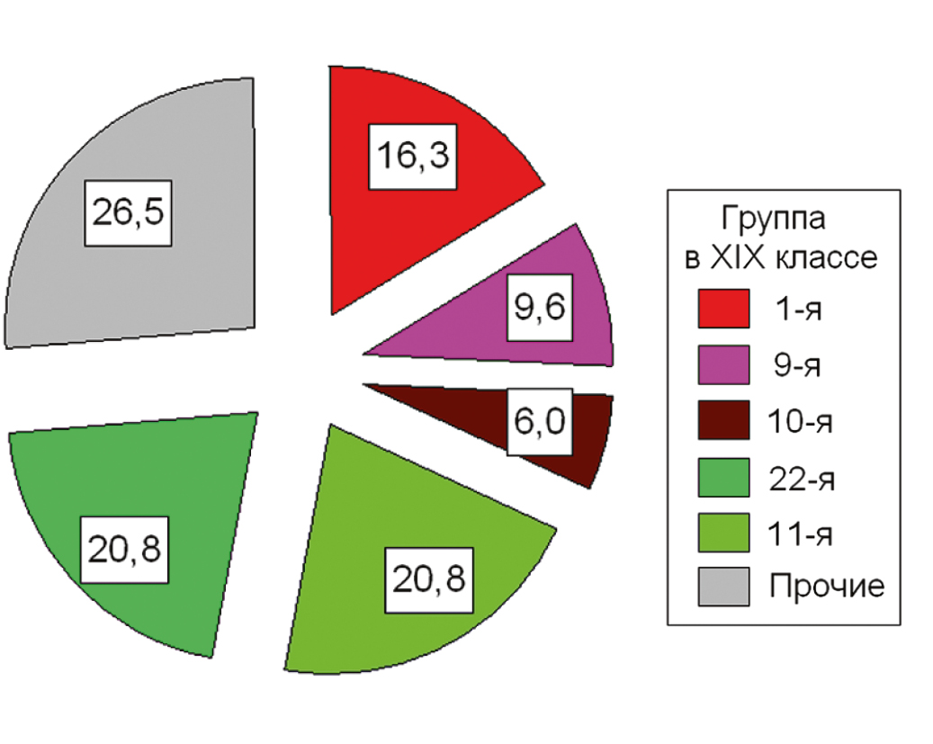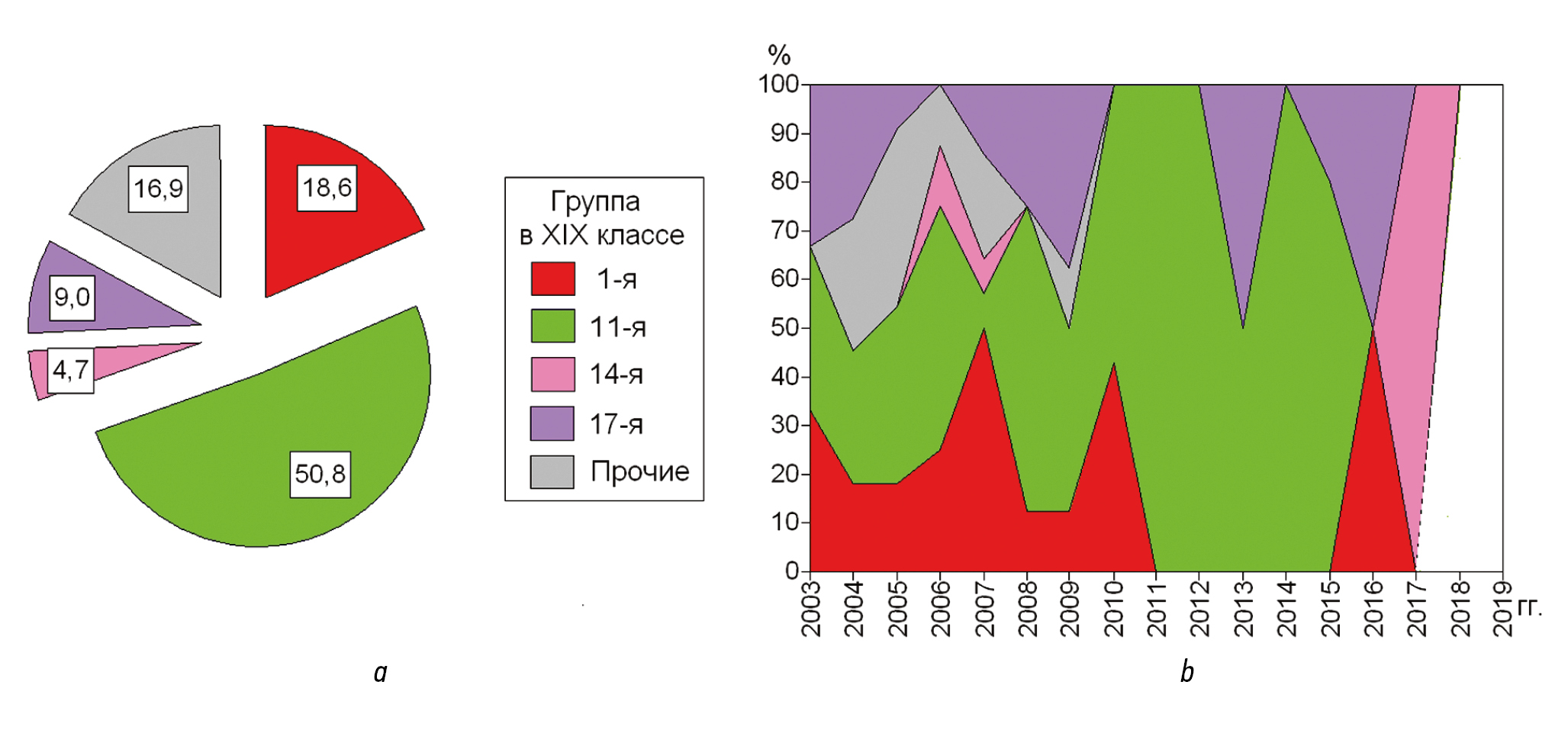 Ведущих групп с долей 5% и более в структуре травматизма было 6. В сумме их вклад составил 85,9% (рис. 2 а). В динамике структуры травматизма отмечается уменьшение вклада 1-й, 6-й и 10-й группы, увеличение — 7-й, 9-й и 22-й группы и относительная стабильность доли — 5-й группы (рис. 2 b).