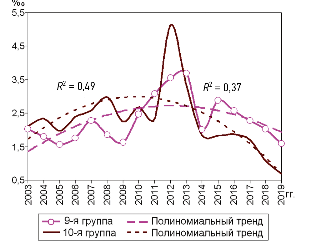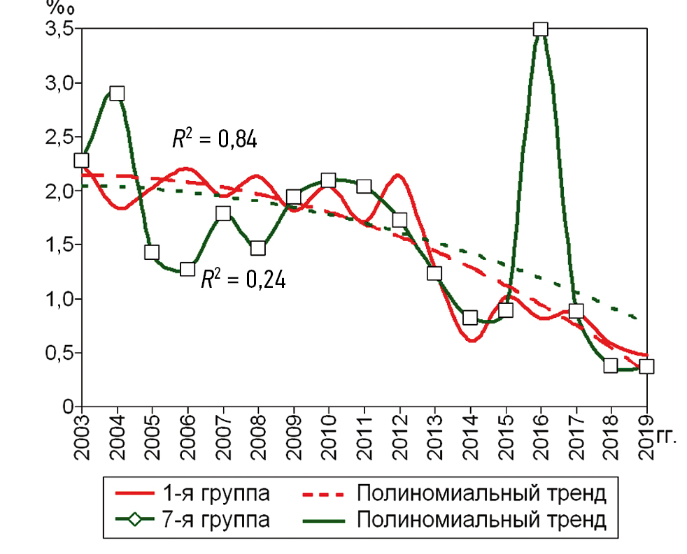 Выявлено, что при низких коэффициентах детерминации полиномиальные тренды травм колена и голени (9-я группа) и голеностопного сустава и стопы (10-я группа) напоминают инвертированную U-кривую со снижением данных в последний период наблюдения (рис. 3). При разных по значимости коэффициентах детерминации отмечается снижение уровня травматизма у военнослужащих-женщин с травмами головы (1-я группа) и травмами запястья и кисти (7-я группа) (рис. 4).