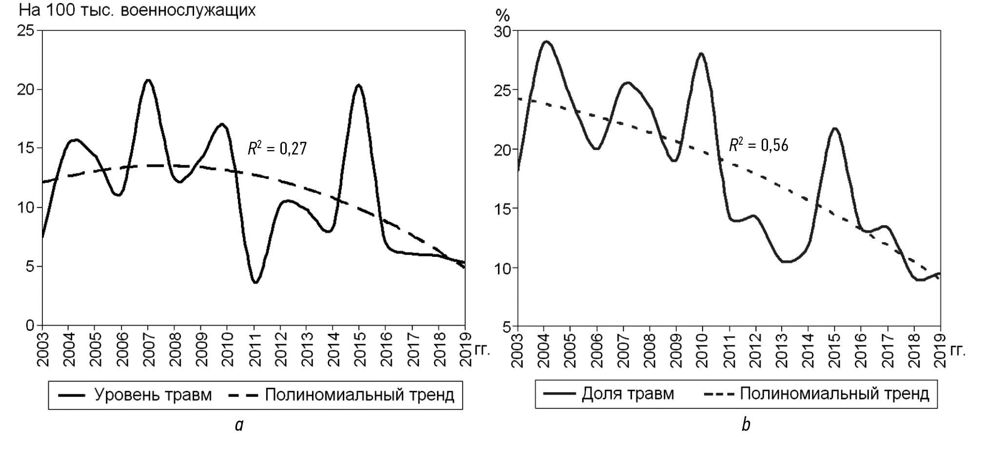 Среднегодовой уровень смертности, обусловленный травмами, в 2003–2019 гг. (рис. 13) составил 11,11 ± 1,26 на 100 тыс. военнослужащих-женщин, смертности по всем классам МКБ-10 — 61,74 ± 4,30. Полиномиальный тренд при низком коэффициенте детерминации (R2 = 0,27) показывает тенденцию уменьшения данных (см. рис. 13, а). Среднегодовая доля смертности военнослужащих с травмами оказалась 18,0 ± 1,6% от структуры смертности по всем классам МКБ-10. Полиномиальный тренд при значимом коэффициенте детерминации (R2 = 0,56) демонстрирует снижение показателей (см. рис. 13, b).