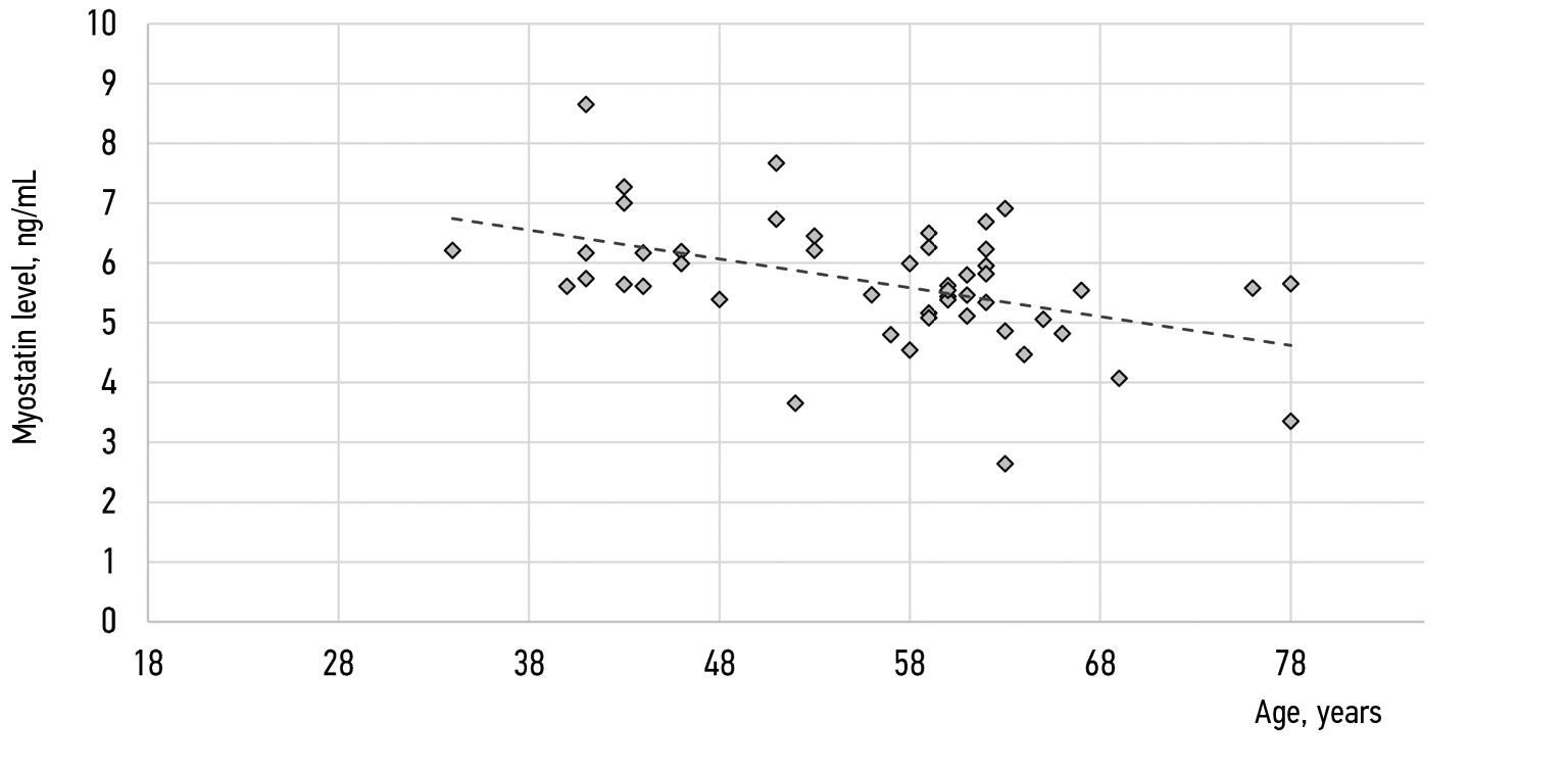 Рис. 1. Корреляционная взаимосвязь между уровнем миостатина и возрастом (рассеяние)