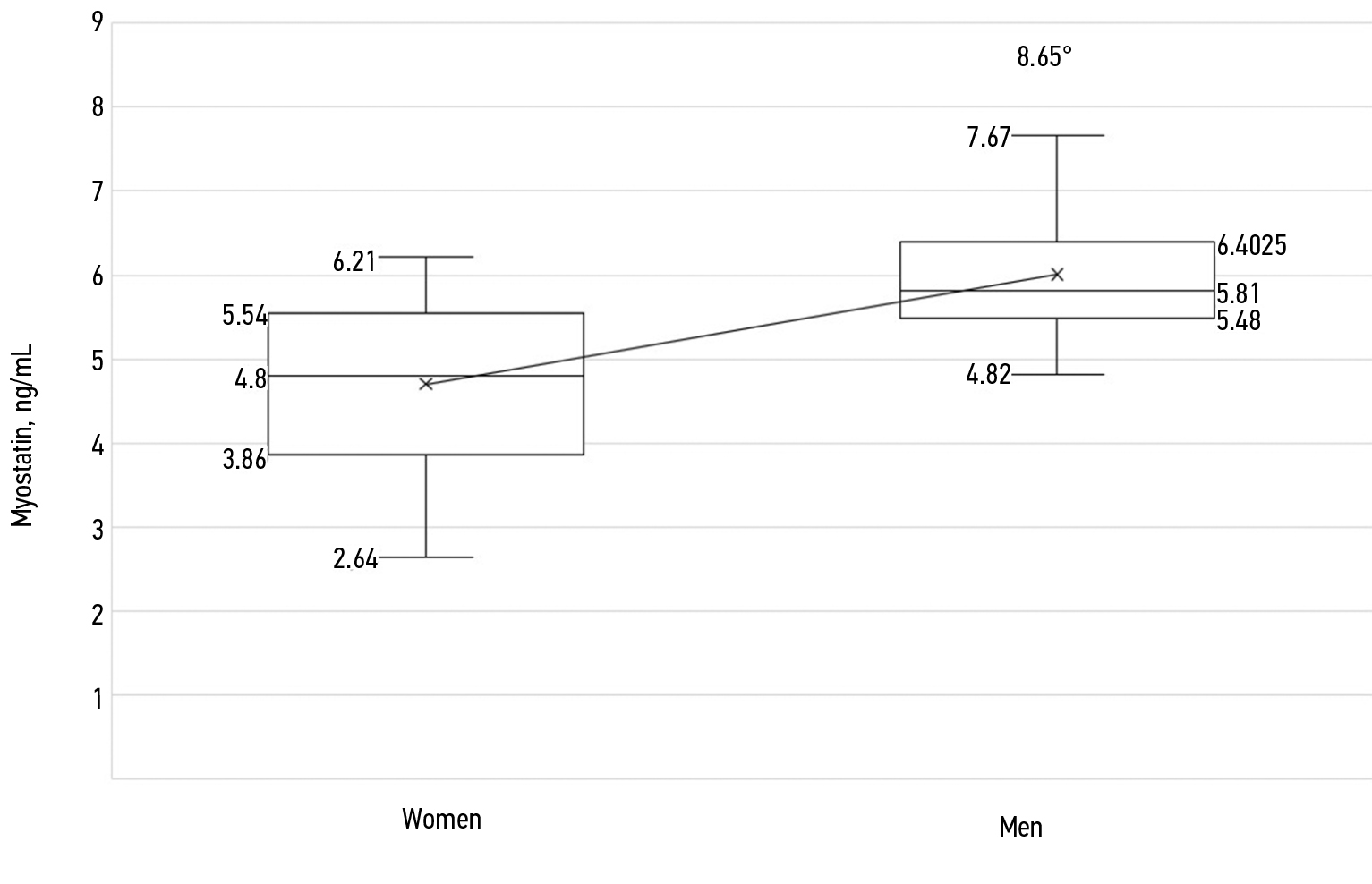The median myostatin level was 5.13 [3.92; 5.975] ng/mL.