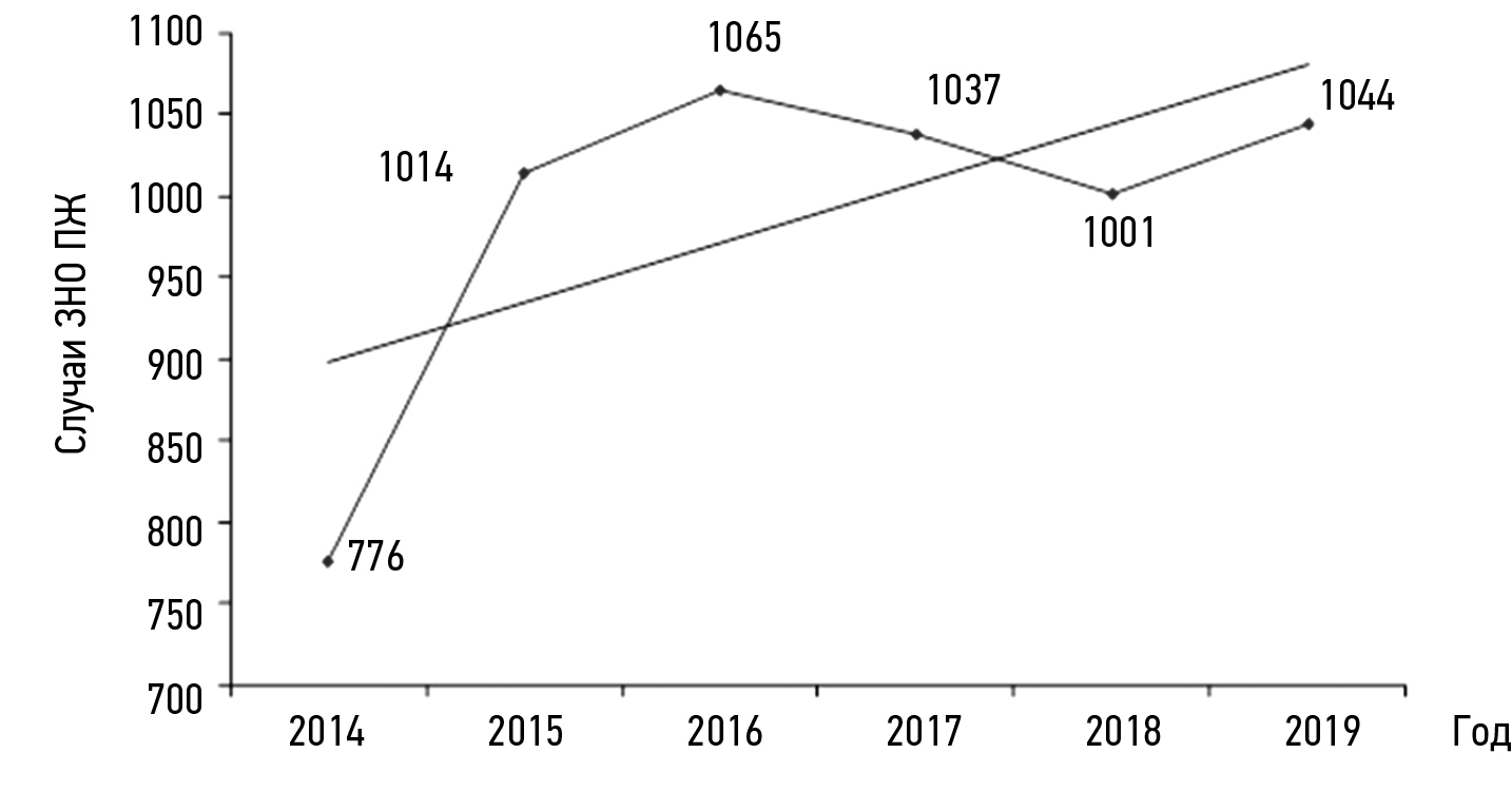 Число впервые выявленных случаев ЗНО ПЖ среди населения СПб имело тенденцию к увеличению с 776 случаев в 2014 г. до 1044 случаев в 2019 г. (рис. 1). Линия тренда данного показателя также имеет тенденцию роста. Прирост показателя за исследуемый период составил +34,5%. Наибольший темп прироста наблюдался в 2015 г. (+30,7%) ввиду усиления организационных мер по контролю за оборотом медицинской документации службой медицинской статистики, а также внедрения современной информационной системы в районах СПб.