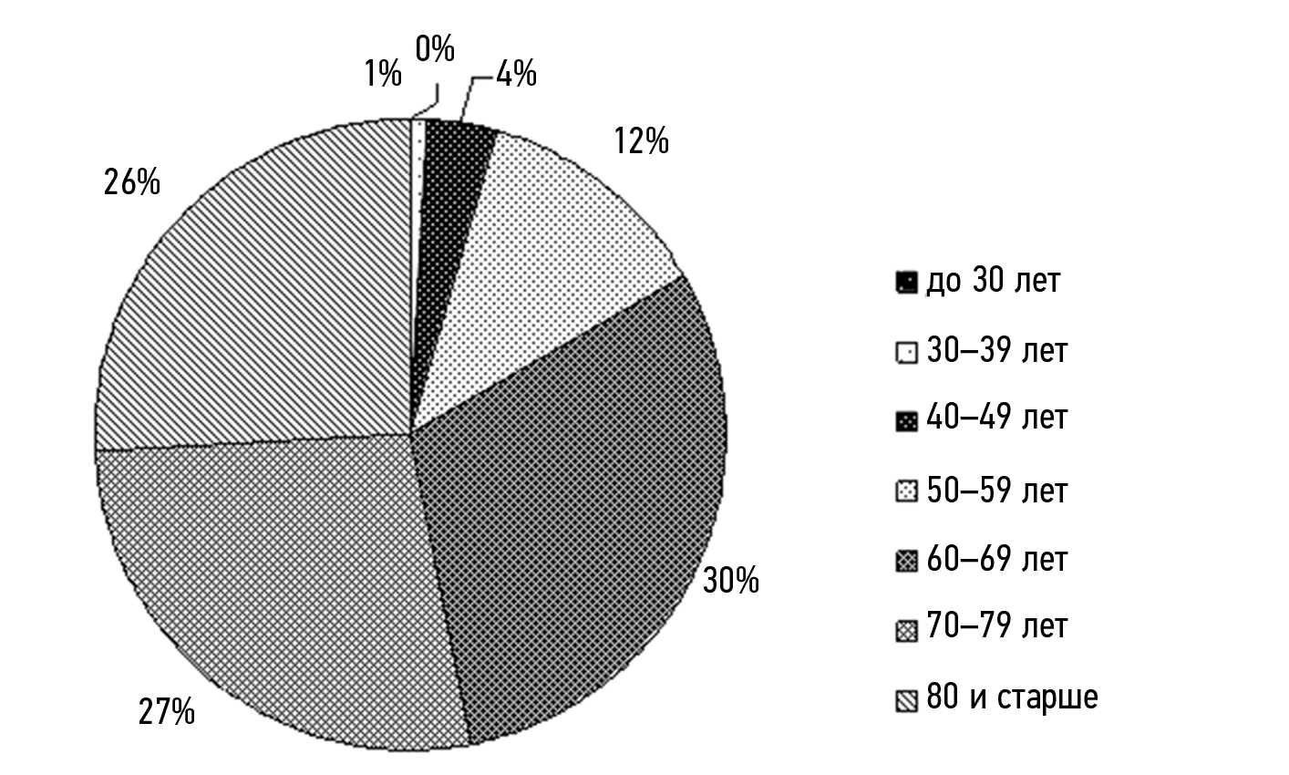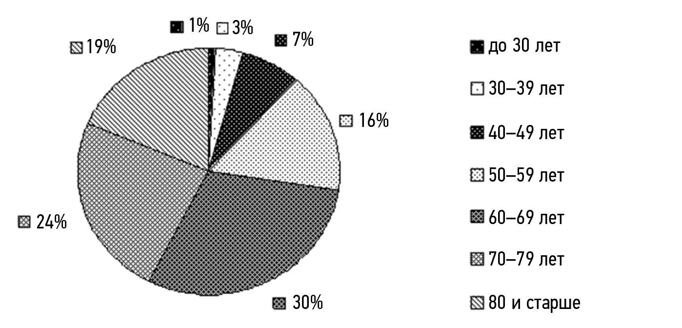 Из рис. 2 следует, что в возрастной структуре больных с впервые выявленными ЗНО всех локализаций в 2019 г. преобладали лица старше 60 лет (72,4%), 60–69 лет —29,8%, 70–79 лет — 23,9%, 80 лет и старше — 18,7% (прирост удельного веса за 6 лет незначителен и составил 1,5%). Около ¼ (26,7%) составили больные в возрасте 30–60 лет, а наименьшая доля (0,9%) представлена лицами от 18 до 30 лет.