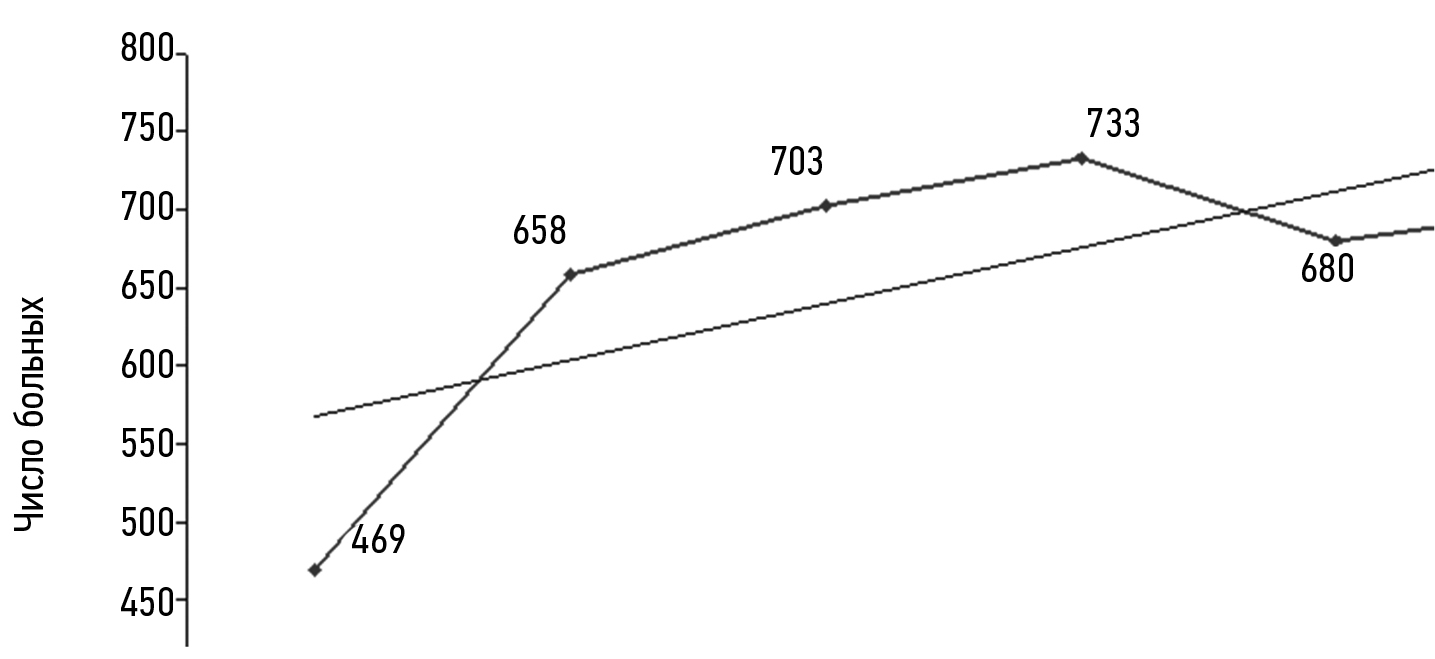 Количество пациентов, взятых на учет с впервые установленным диагнозом ЗНО ПЖ за изученный период, имело тенденцию к росту. Прирост данного показателя составил +49,8%: с 469 человек (10,5 на 100 000 соответствующего населения) в 2014 г. до 703 человек (15,5 на 100 000 соответствующего населения) в 2019 г. (t = 6,8; р < 0,001). Линия тренда данного показателя также имеет тенденцию к росту (рис. 4).
