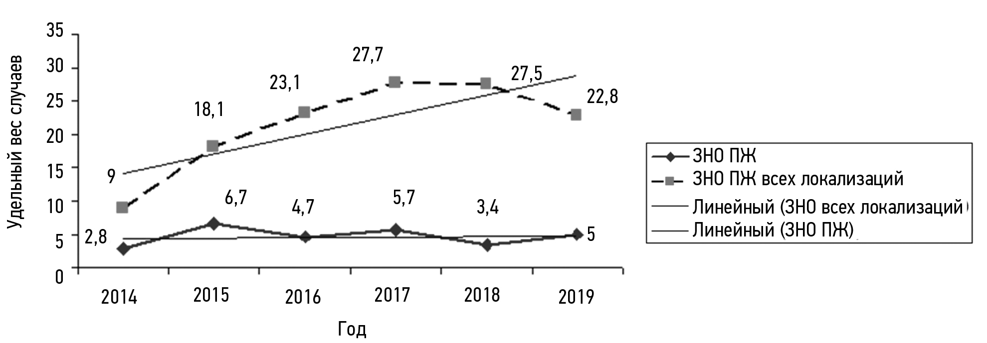 Число впервые выявленных ЗНО за год на протяжении всего исследуемого периода было больше у женщин, имея тенденцию к росту с 12 754 случаев в 2014 г. до 16 361 случаев в 2019 г. У мужчин данный показатель составил 8822 случаев в 2014 г. и 10 906 случаев в 2019 г. Однако «грубый» показатель заболеваемости ЗНО ПЖ был выше у мужчин и составил 12,4 в 2014 г. и 14,1 в 2019 г. (темп прироста за 6 лет — 13,7%). У женщин данный показатель составил 10,6 в 2014 г. и 13,2 в 2019 г. (темп прироста за 6 лет — 24,5%).