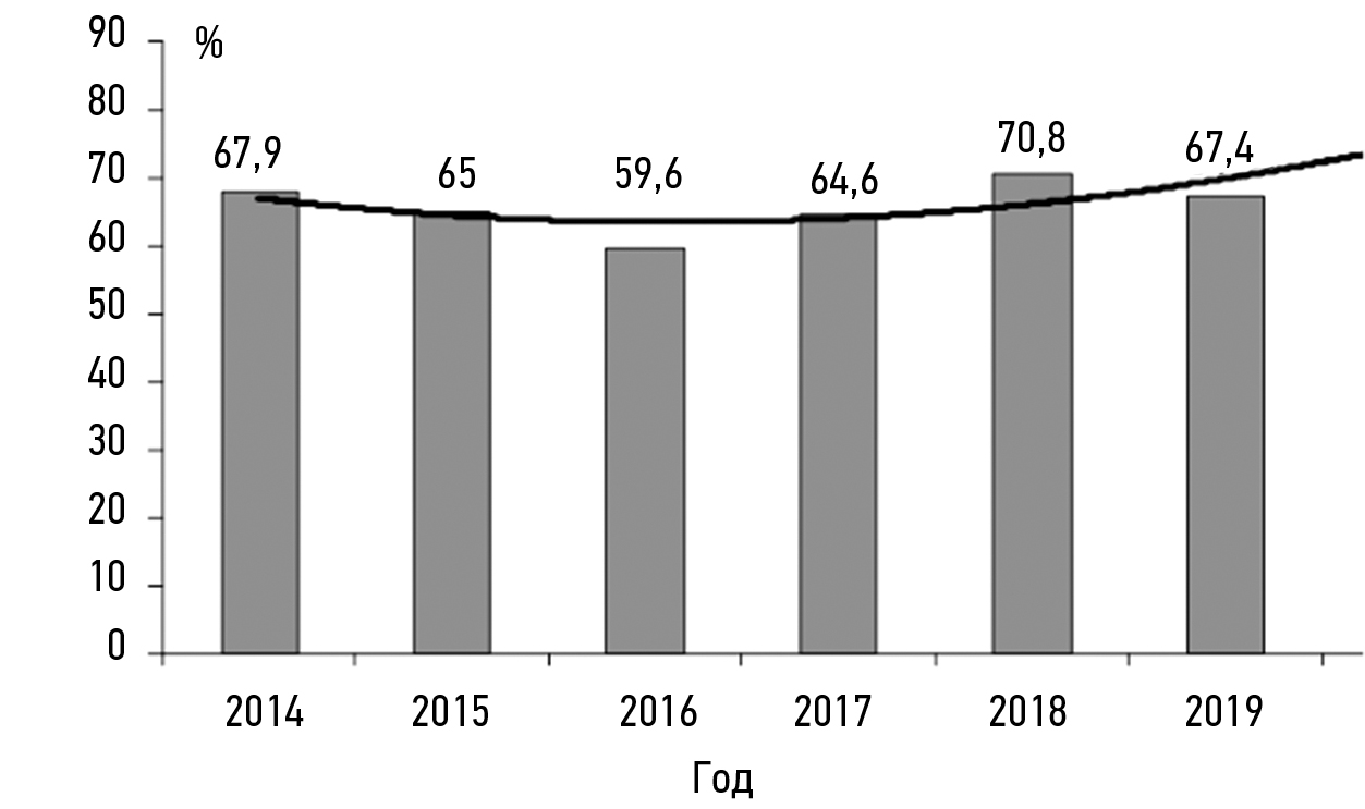 Доля больных, умерших в течение первого года после установления диагноза ЗНО ПЖ, из взятых на учет в предыдущем году оставалась неизменно высокой. В целом с 2014 г. по 2019 г. одногодичная летальность не изменилась и составила 67,9 и 67,4% соответственно (убыль — 0,7%) (рис. 6).