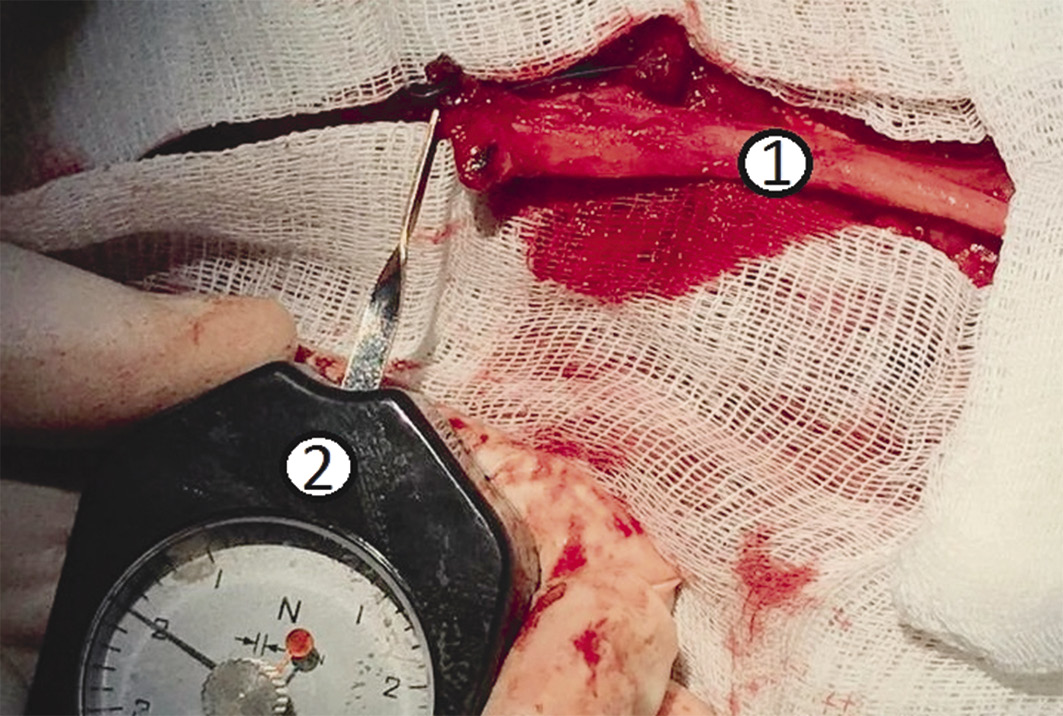 Рис. 1. Воздействие силой натяжения на проксимальный отрезок нерва: 1 — проксимальный отрезок общего малоберцового нерва; 2 — устройство для изучения биомеханических свойств нерва в глубине операционной раны / Fig. 1. The effect of tension on the proximal segment of the nerve: 1 — the proximal segment of the common fibular nerve; 2 — a device for studying the biomechanical properties of the nerve in the depth of the surgical wound