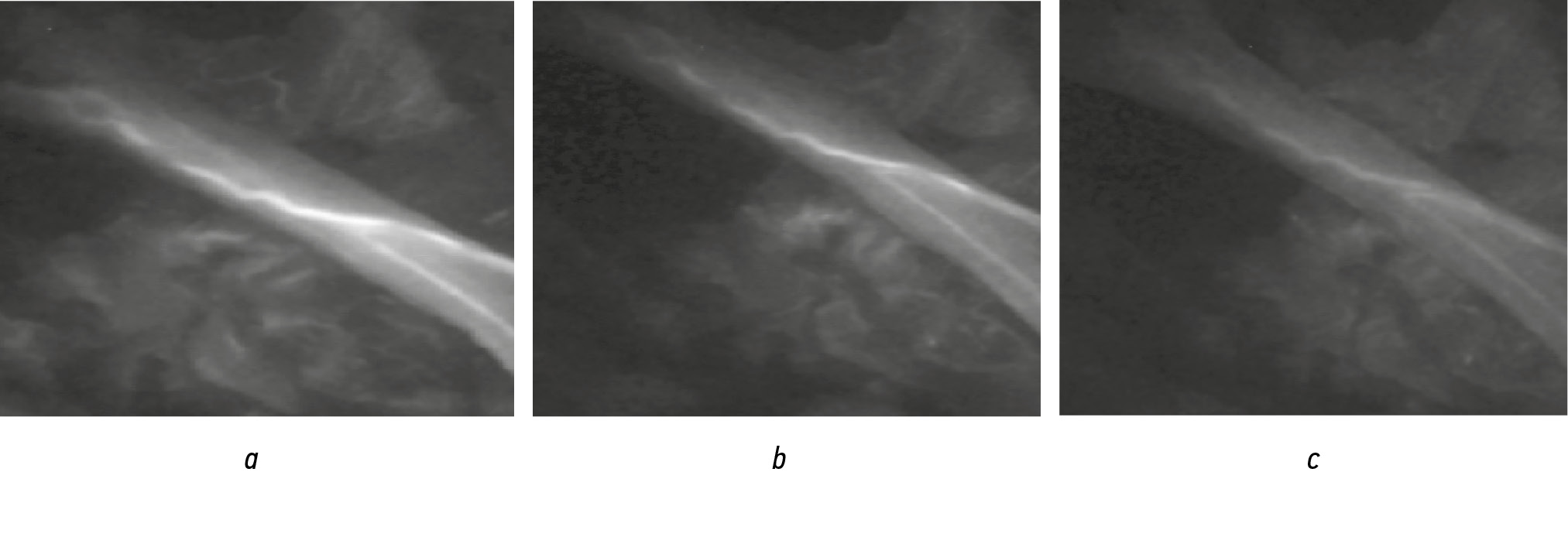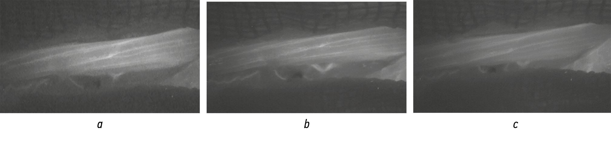 Рис. 2. ИЦЗ-ангиограммы ствола лучевого нерва: а — без воздействия силы натяжения; b — при воздействии силой натяжения в 2 Н; c – при воздействии силы натяжения в 3 Н / Fig. 2.Indocyanine green (ICG)-angiograms of the radial nerve trunk: a — without the influence of the tension force; b — when exposed to a tension force of 2 N; c — when exposed to a tension force of 3 N