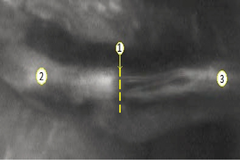 Рис. 5. ИЦЗ-ангиограмма ствола локтевого нерва после наложения эпиневрального шва, отсутствие адекватного кровоснабжения: 1 — проекция линии эпиневрального микрохирургического шва; 2 — дистальный отрезок локтевого нерва; 3 — проксимальный отрезок локтевого нерва / Fig. 5. ICG-angiogram of the ulnar nerve trunk after epineural suture, lack of adequate blood supply: 1 — projection of the epineural microsurgical suture line; 2 — distal segment of the ulnar nerve; 3 — proximal segment of the ulnar nerve