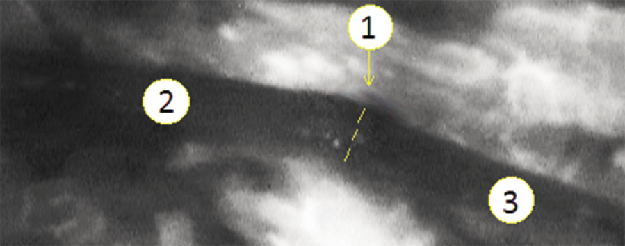 Рис. 4. ИЦЗ-ангиограмма ствола срединного нерва после наложения эпиневрального шва: 1 — проекция линии микрохирургического эпиневрального шва; 2 — проксимальный отрезок срединного нерва; 3 — дистальный фрагмент срединного нерва / Fig. 4. ICG-angiogram of the median nerve trunk after epineural suture: 1 —projection of the microsurgical epineural suture line; 2 — proximal segment of the median nerve; 3 — distal fragment of the median nerve