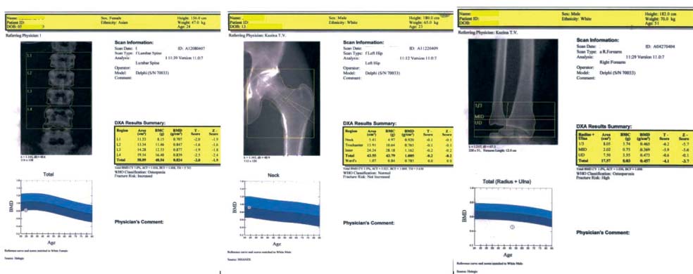 Степень снижения МПКТ устанавливали согласно принятой классификации Всемирной организации здравоохраненя по Т- и Z-критериям. Степень тяжести остеопороза устанавливали по отклонениям в стандартных единицах (SD):