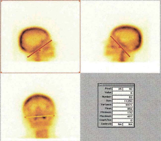 Математическую обработку изображений проводили за счет получения количественных критериев включения РФП (импульс/пиксел) в ВНЧС с обеих сторон. С этой целью выбирали «зоны интереса» в проекции ВНЧС слева и справа и «зону стандартной привязки» в области основной кости. При визуальном анализе сцинтиграмм и при обработке данных сравнивали содержание РФП в симметричных «зонах интереса» и в «зоне стандартной привязки», на основании чего определяли факт наличия очаговой патологии, локализацию процесса, количество и размеры очагов поражения. Степень захвата РФП определяли на основании соотношения среднего числа импульс/пикселов в ячейке матрицы над «зоной интереса» и среднего числа импульс/пикселов в ячейке матрицы над изображением «зоны стандартной привязки». В результате деления счета в «зоне интереса» на счет в «зоне стандартной привязки» получали коэффициент накопления радиофармпрепарата (КН РФП).