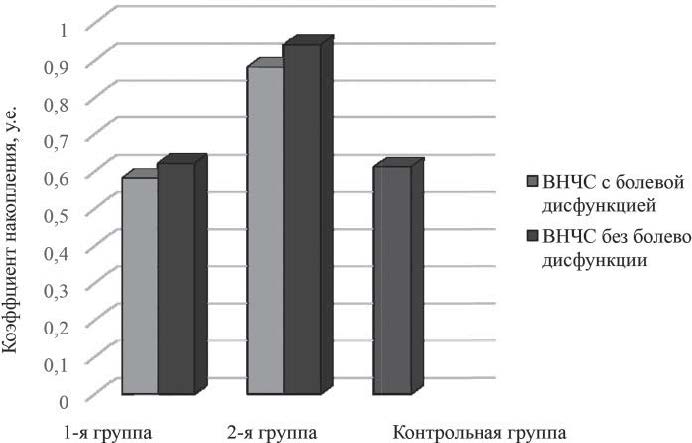 Значения КН РФП в контрольной группе составили 0,61±0,04 у.е. с обеих сторон. У пациентов 1-й группы не выявлено повышенной аккумуляции радиоиндикатора ни на стороне боли, ни на противоположной стороне (p>0,05) (физиологическая норма).