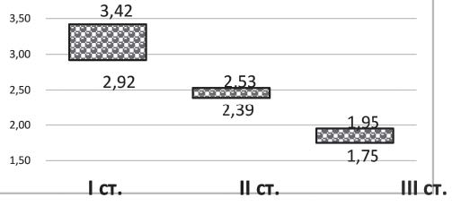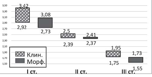 Диапазон значений 95% ДИ показателей просвета канала БСДК у пациентов (2,74<XIст>3,08; 2,37<XIIст>2,41; 1,55<XIIIст>1,73) для наглядности принадлежности к конкретной стадии заболевания (и соответствия контрольной группе) представлен на рисунке 2.