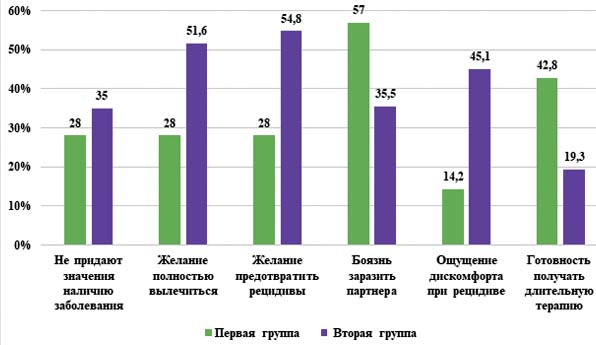 57% пациентов первой и 35% пациентов второй группы с ГГ боялись заразить полового партнера и высказали готовность получать длительную терапию для предотвращения рецидивов, в том числе супрессивную (43% пациентов первой и 19% второй группы) (рис.). Не придавали значения наличию у них ГГ около 30% пациентов.