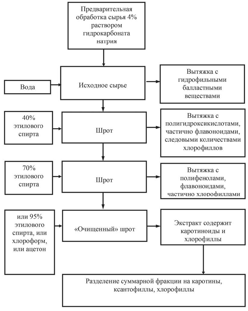 Спиртовую фракцию, содержащую ксантофиллы и хлорофиллы, обрабатывали петролейным эфиром. В результате хлорофиллы концентрировались в петролейном эфире, а ксантофиллы как более полярные соединения экстрагировались этиловым спиртом.