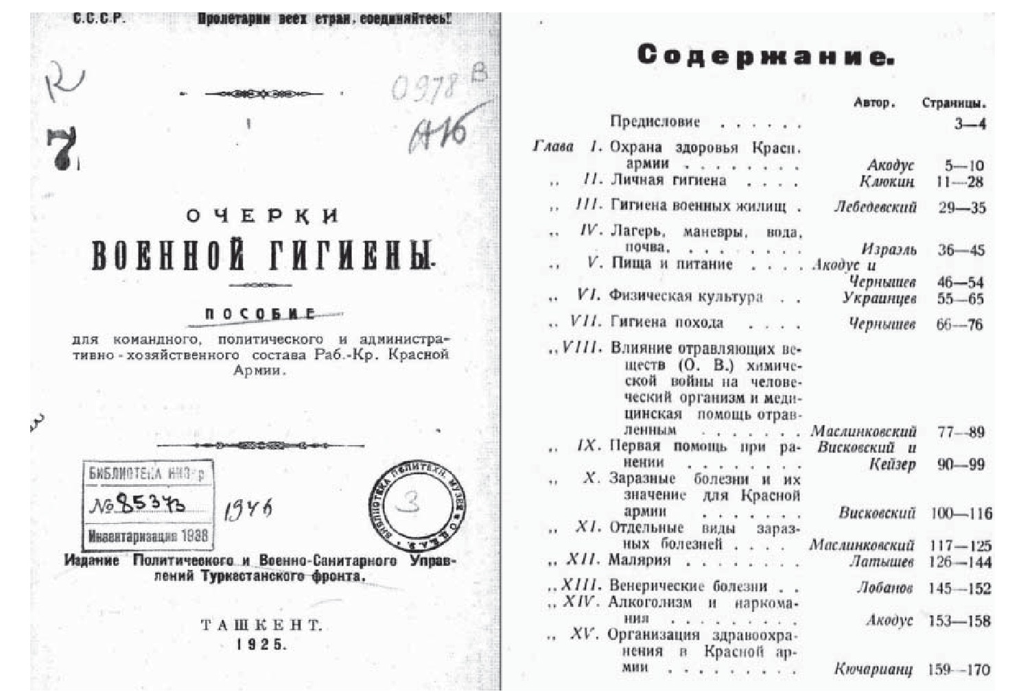 Примером возвращения мнения о необходимости обучать командиров основам военной гигиены является издание в 1925 г. «Очерков военной гигиены» (тираж 3500 экземпляров) штабом Туркестанского фронта [13]. Общее представление о структуре, объёме, авторах даёт содержание (оглавление) данного труда (рис. 1).
