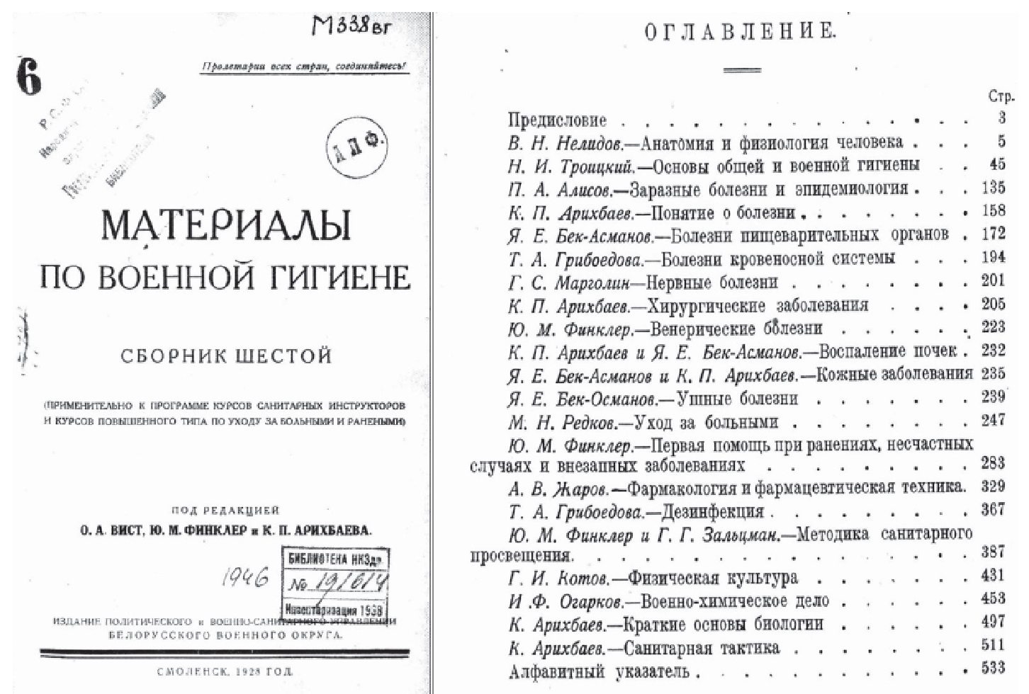- Материалы по военной гигиене / под ред. О.А. Вист, Ю.М. Финклер и К.П. Арихбаева. – Смоленск: Изд-во Полит. и Воен.- сан. упр. Белорус. воен. округа, 1928. – 535 с.
