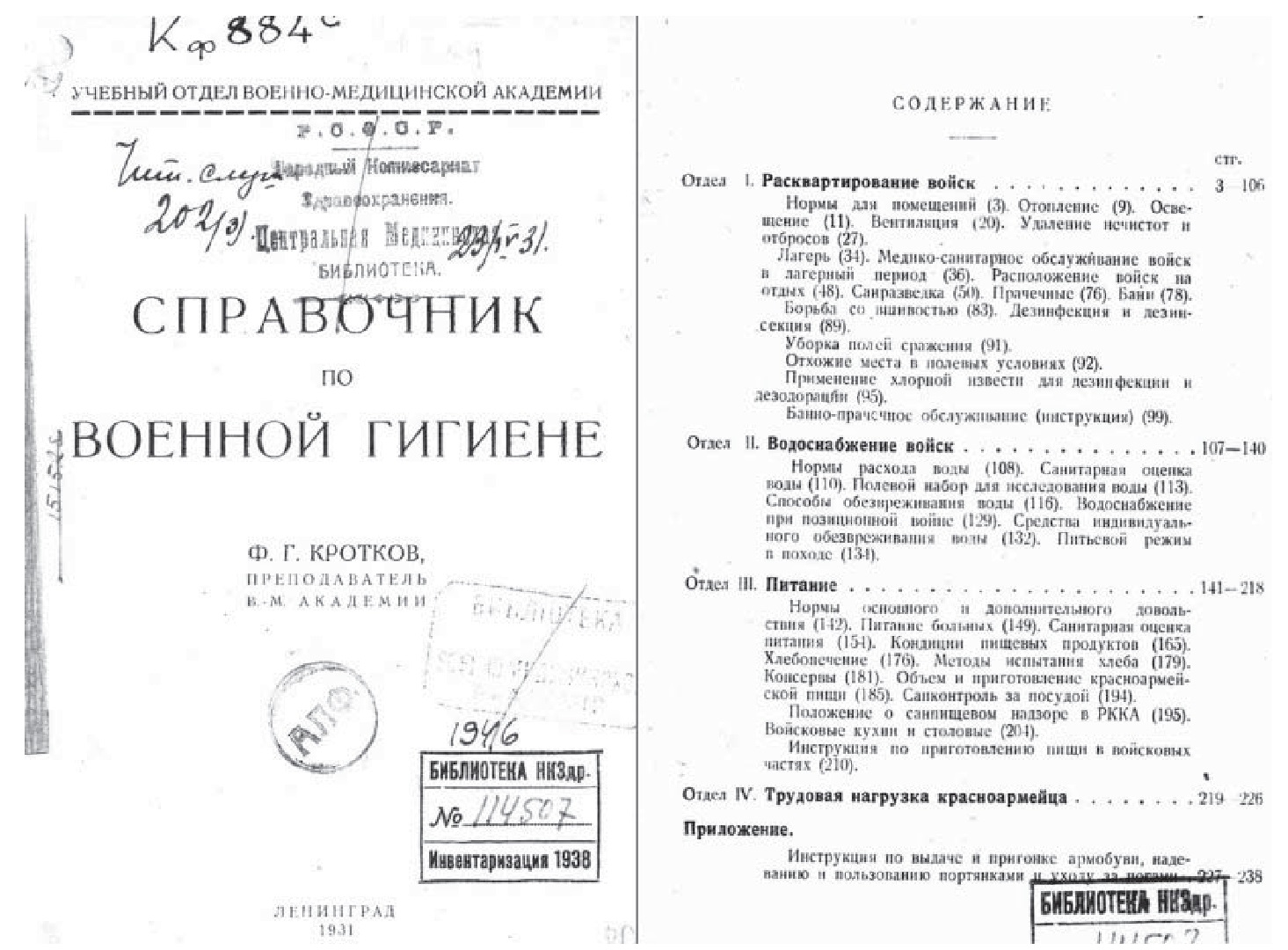 В эти же годы видный советский гигиенист и общественный деятель Фёдор Григорьевич Кротков (1896–1983), будучи ещё преподавателем Военно-медицинской академии, в 1931 г. публикует «Справочник по военной гигиене» [4] (рис. 3). По содержанию этого справочника видно, что автор разделил свой труд на 4 самостоятельных отдела – «расквартирование войск», «водоснабжение войск», «питание» и «трудовая нагрузка красноармейца», – каждый из которых представлен достаточно подробным описанием всех необходимых мероприятий.
