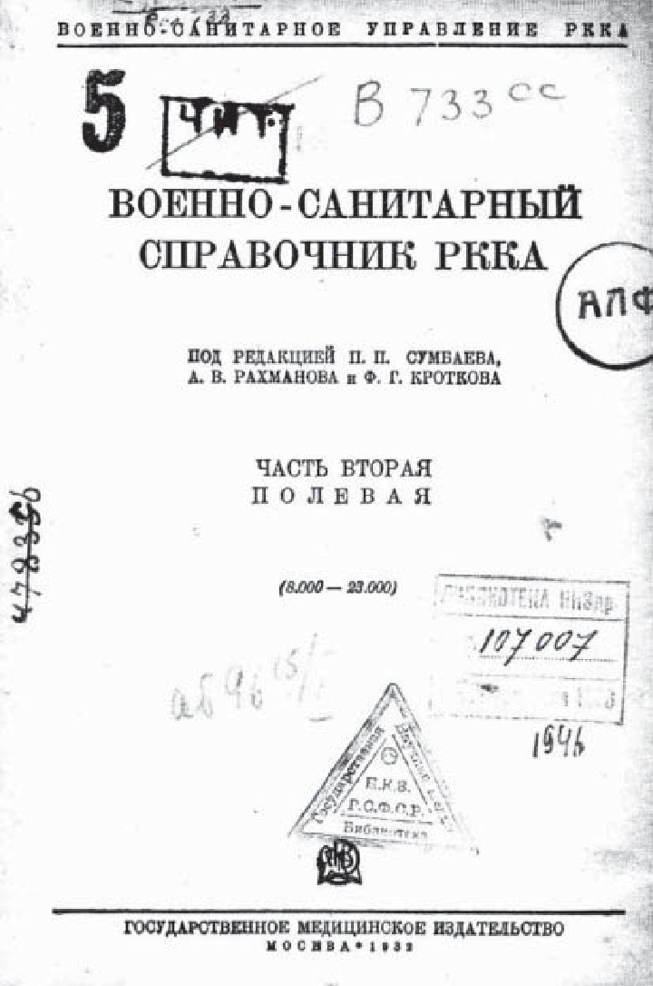 Годом позже, в 1932 г. Военно-санитарное управление РККА издаёт «Военно-санитарный справочник РККА» под редакцией П.П. Сумбаева, А.В. Рахманова и Ф.Г. Кроткова в двух частях и весьма солидным тиражом (более 8 тыс. экз.) [2] (рис. 4).
