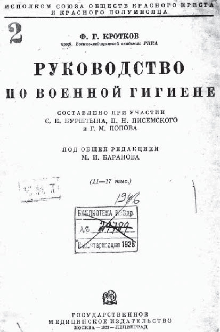 В начале 30-х годов прошлого века происходит интенсивное развитие военной гигиены социалистического государства. Одним из активных специалистов в этой области становится профессор Военно-медицинской академии РККА Фёдор Григорьевич Кротков. В 1933 г. он издаёт Руководство по военной гигиене [6] (рис. 5).