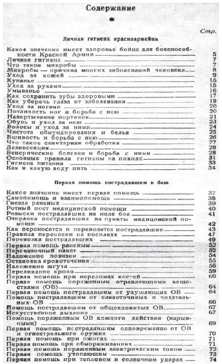 «Первая медицинская помощь» приведены её особенности: при ранениях, при поражениях отравляющими веществами, при отравлениях, тепловом и солнечном ударах, ожогах, обморожениях и замерзании, утоплении и оживлении мнимоутонувших. Таким образом, этот справочник можно считать руководством по вопросам организации медицинских и гигиенических мероприятий в полевых условиях на данный исторический момент.
