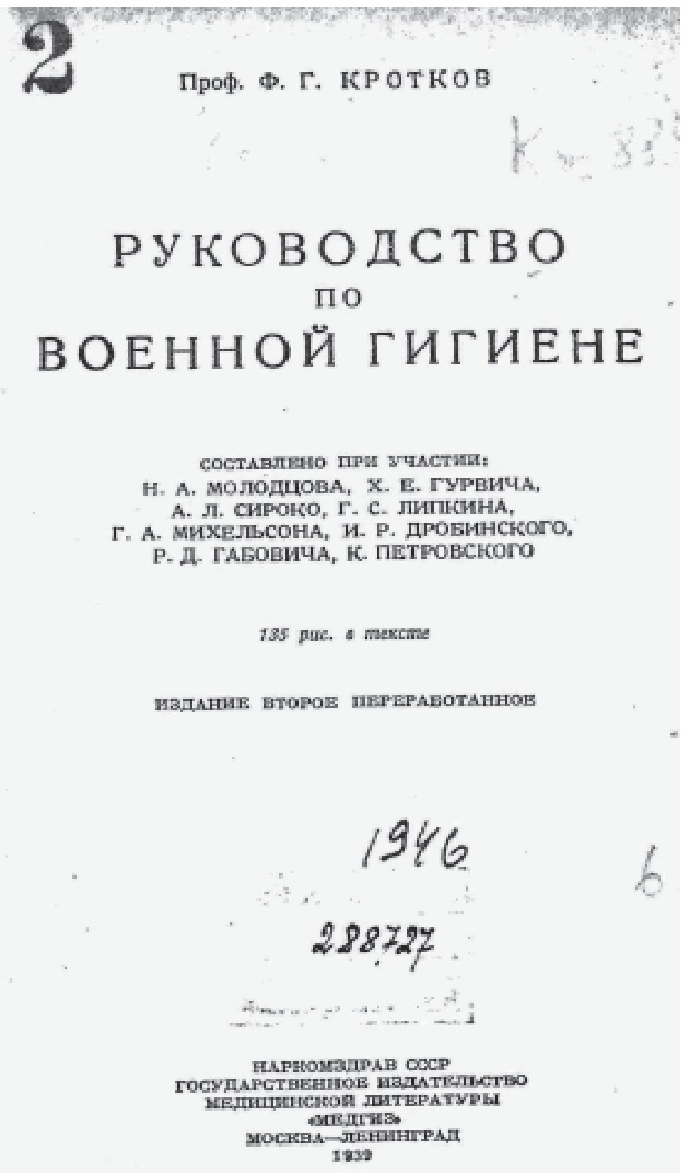 К 1939 г. профессор Ф.Г. Кротков создаёт творческий коллектив, который под его руководством издаёт второе переработанное Руководство по военной гигиене [4] (рис. 7).