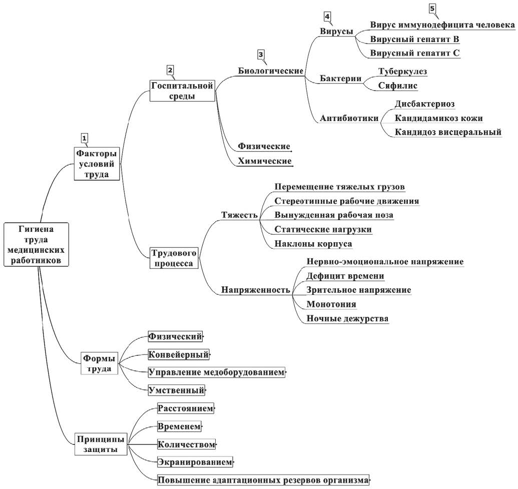 Рис. Интеллект-карта «Гигиена труда медицинских работников». 1–5 – уровни ветвей интеллект-карты