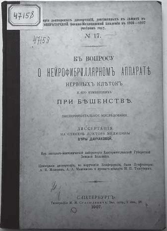 - Данчакова, В.М. К вопросу о нейрофибриллярном аппарате нервных клеток и его изменениях при бешенстве: дис. … д-ра медицины / В.М. Данчакова – СПб.: тип. М.М. Стасюлевича, 1907. – 87 с.