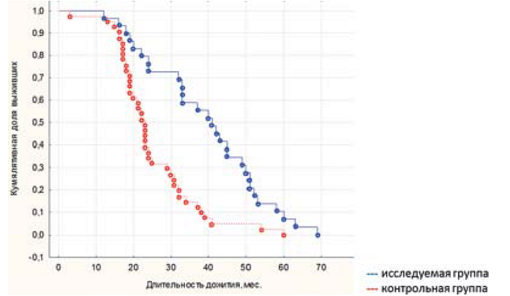 Рис. 8. Показатели общей выживаемости больных в подгруппе Grade IV исследуемой (n=49) и контрольной (n=49) групп