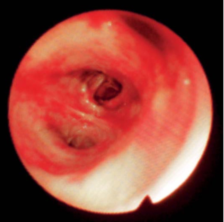 По результатам обследования пострадавшие были разделены на 3 группы: с обширным УЛ (131 человек), с ограниченным УЛ (87 человек) и без УЛ (102 человека). По данным БФС, УЛ проявлялся наличием петехий, субмукозных кровоизлияний и отека слизистой устья сегментарных бронхов, а также наличием крови в их просвете. В ряде случаев субмукозные кровоизлияния и отек слизистой распространялись до устьев главных бронхов (рис. 1).