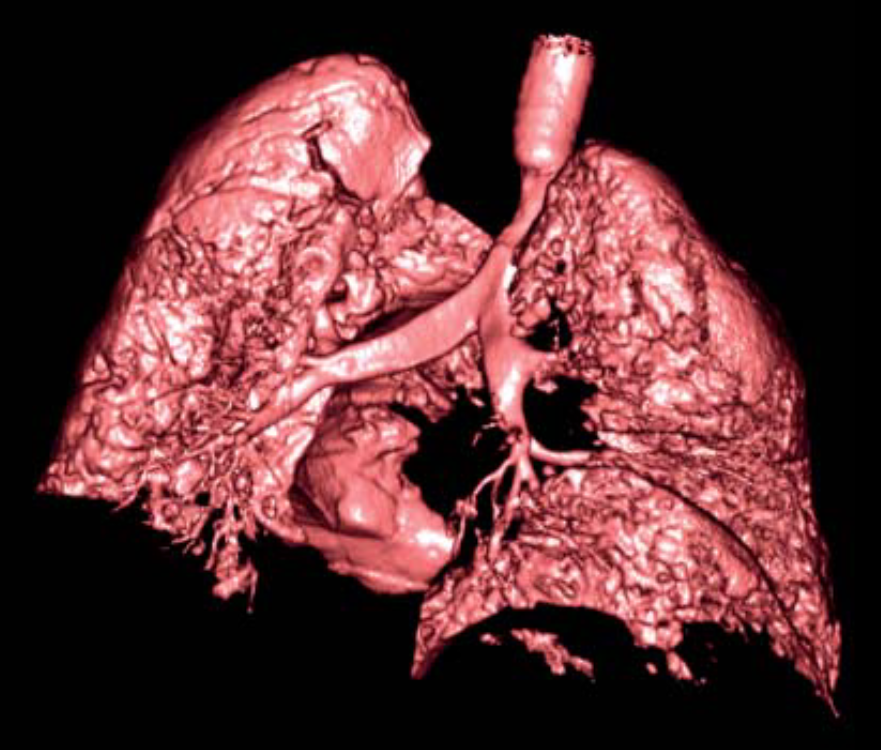 Рис. 2. Невентилируемые участки ушиба задн-базальных отделов средней и нижней долей правого легкого. Трехмерная реконструкция