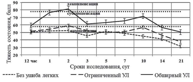 Причем в первые и вторые сутки после получения травмы индекс тяжести состояния находился в области декомпенсации, а в период 7–10 суток – на границе суби декомпенсации. Группы пострадавших с ограниченным УЛ и без ушиба по величине индекса тяжести состояния и его динамике практически не различались, при этом значения индекса находились в области компенсации (рис. 3).