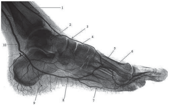 Рис. 1. Артерии стопы. Поствитальная ангиограмма. Боковая проекция: 1 – передняя большеберцовая артерия; 2, 4 – латеральная предплюсневая артерия; 3 – тыльная артерия стопы; 5 – глубокая подошвенная ветвь; 6 – тыльная плюсневая артерия; 7 – подошвенная плюсневая артерия; 8 – латеральная подошвенная артерия; 9 – медиальная подошвенная артерия; 10 – задняя большеберцовая артерия