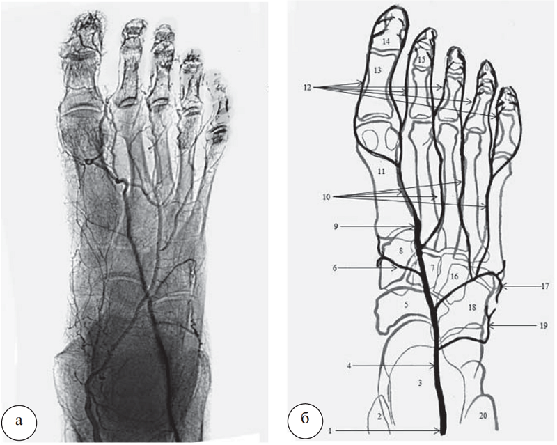 Рис. 2. Вариант прямолинейной архитектоники ствола ТАС: а – ангиорентгенограмма; б – схема ТАС и ее ветвей (подошвенные артерии на схеме отсутствуют). 1 – передняя большеберцовая артерия; 2 – медиальная лодыжка; 3 – таранная и пяточная кости; 4 – тыльная артерия стопы; 5 – ладьевидная кость; 6 – медиальная предплюсневая артерия; 7 – промежуточная клиновидная кость; 8 – медиальная клиновидная кость; 9 – глубокая подошвенная ветвь; 10 – тыльные плюсневые артерии; 11 – I плюсневая кость; 12 – тыльные пальцевые артерии; 13 – проксимальная фаланга I пальца; 14 – дистальная фаланга I пальца; 15 – средняя фаланга II пальца; 16 – латеральная клиновидная кость; 17 – дугообразная артерия; 18 – кубовидная кость; 19 – латеральная предплюсневая артерия; 20 – латеральная лодыжка
