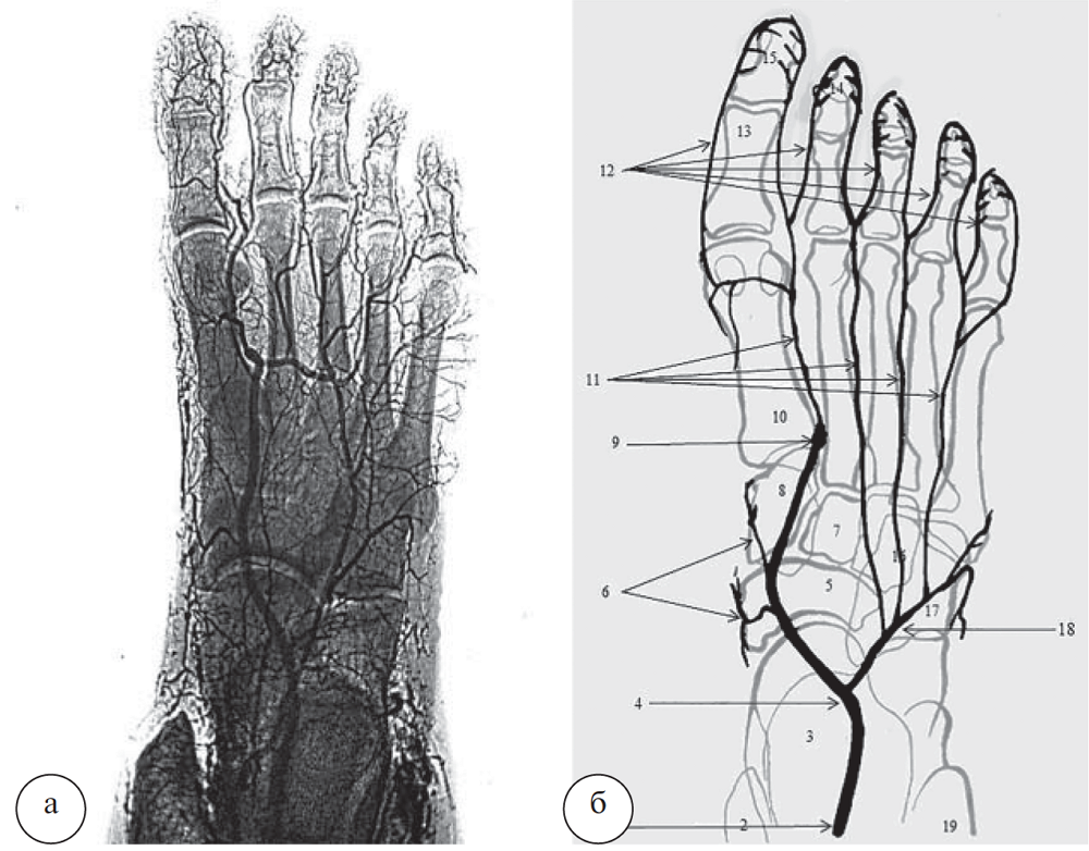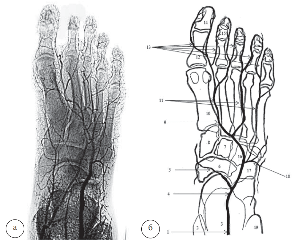 Рис. 4. Вариант архитектоники тыльной артерии стопы с выраженным изгибом ствола в латеральную сторону: а – ангиорентгенограмма; б – схема ТАС и ее ветвей (подошвенные артерии на схеме отсутствуют). 1 – передняя большеберцовая артерия; 2 – медиальная лодыжка; 3 – таранная и пяточная кости; 4 – тыльная артерия стопы; 5 – ладьевидная кость; 6 – медиальные предплюсневые артерии; 7 – промежуточная клиновидная кость; 8 – медиальная клиновидная кость; 9 – глубокая подошвенная ветвь; 10 – плюсневая кость; 11 – тыльные плюсневые артерии; 12 – проксимальная фаланга I пальца; 13 – тыльные пальцевые артерии; 14 – дистальная I фаланга пальца; 15 – средняя фаланга II пальца; 16 – латеральная клиновидная кость; 17 – кубовидная кость; 18 – дугообразная артерия; 19 – латеральная лодыжка шинстве случаев латеральная предплюсневая артерия отсутствует.
