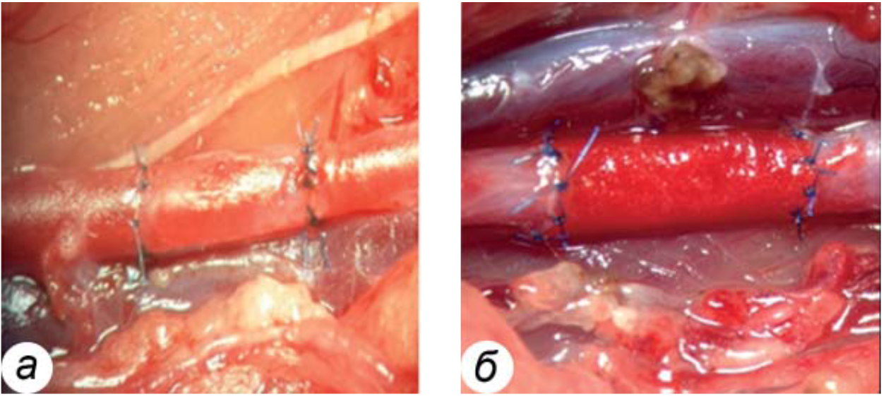Рис. 3. Трансплантированный протез из децеллюляризированной аорты (а) и биорезорбируемого материала (б). Ув. ×6