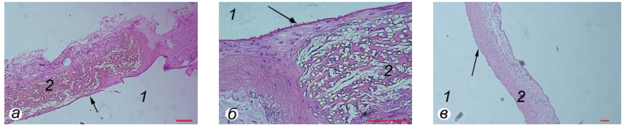 Рис. 7. Рецеллюляризация протезов из биорезорбируемого материала (а, б) и децеллюляризированной аорты (в). Окраска гематоксилин-эозином. Стрелками отмечен сформировавшийся эндотелиальный слой: 1 – внутреннее пространство сосуда, 2 – протез. Масштабный отрезок – 50 мкм