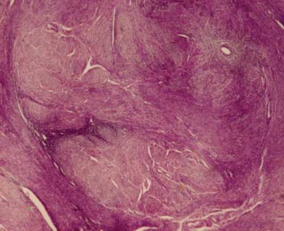 Рис. 1. Очаг Ам с ПЛГ, отграниченный от окружающего миометрия. Окраска – гематоксилин-эозин, ув. х200