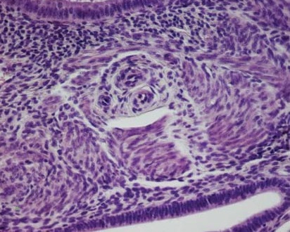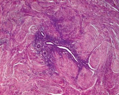 Рис. 2. Лейомиоматозная пролиферация в цитогенной строме ЭГ в непосредственной топографической связи с сосудами микроциркуляторного русла. Окраска – гематоксилин-эозин, ув. х400