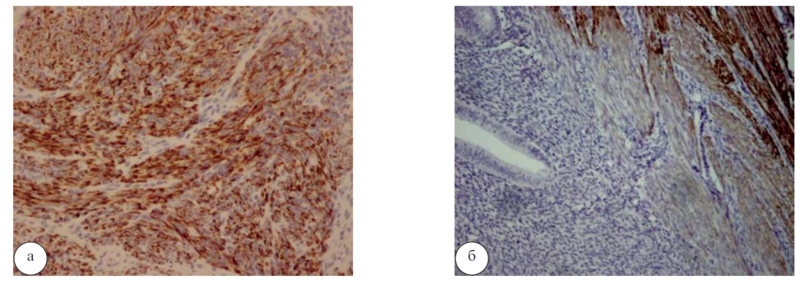 Рис. 4. Экспрессия десмина в зонах ПЛГ: а – поверхностно расположенного очага Ам; б – глубоко расположенного очага Ам